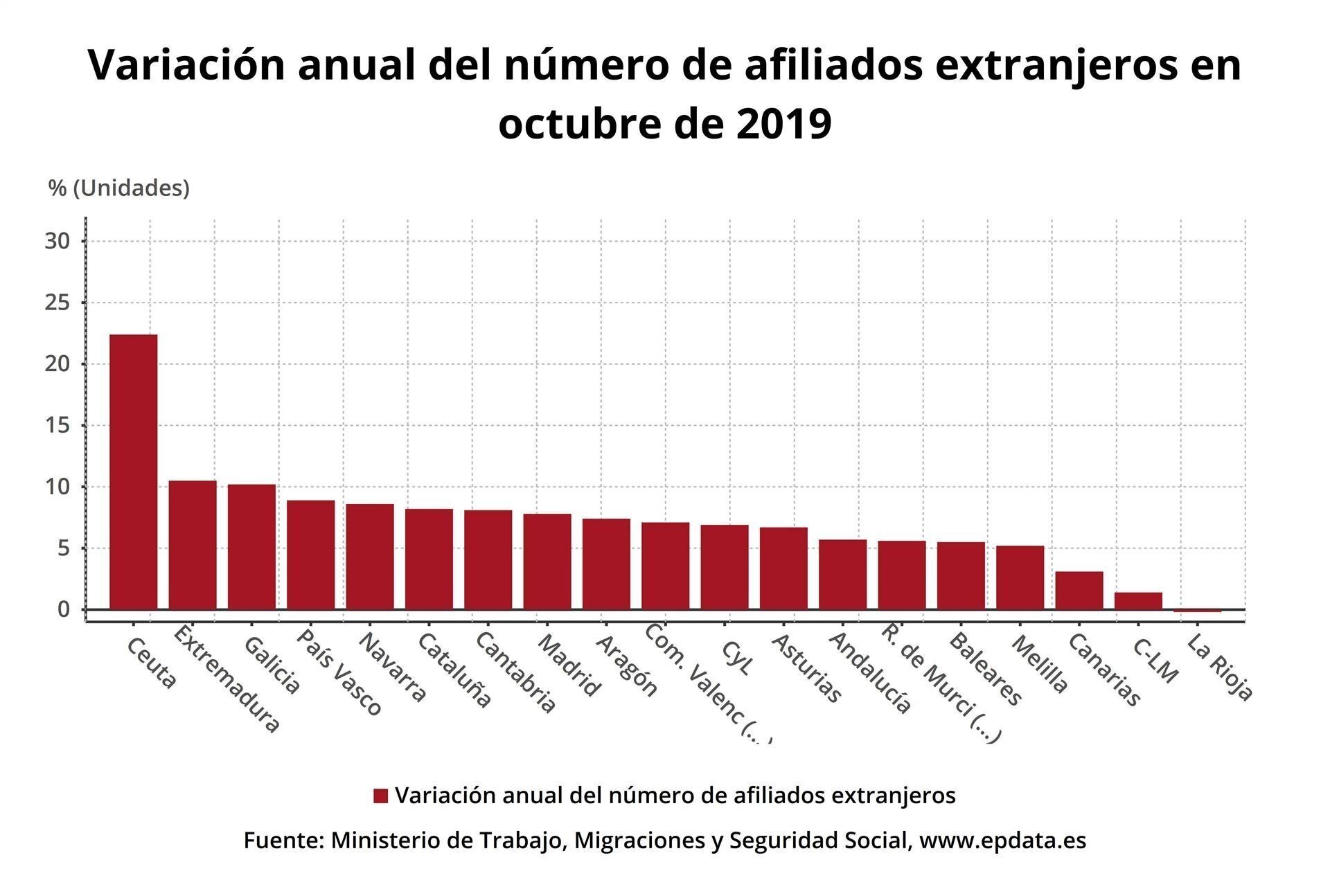 Sin embargo, en términos interanuales, la afiliación de extranjeros creció en 1.020 cotizantes en noviembre, un 8,6% más que en el mismo mes de 2018, más de un punto por encima del crecimiento medio del 7,2%.