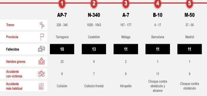 Asimismo, el estudio también ha identificado los lugares más peligrosos para conducir de noche en España. Para ello, se han aislado tramos de 20 kilómetros en los que se hayan producido al menos cinco fallecidos durante la última década disponible (2013-2022). Los tramos más peligrosos de España para conducir de noche lo encabezan la AP-7, en su paso por Tarragona (km 328-345, 18 fallecidos), la N-340, en Castellón (km 1028-1043, 13 fallecidos) y la A-7 en Málaga (km 167-177, 11 fallecidos).