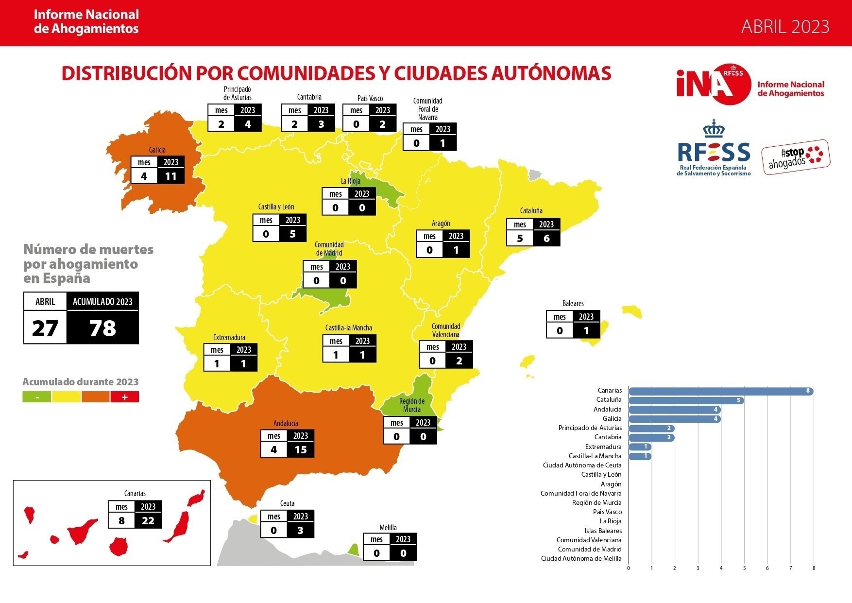 Canarias es la comunidad autónoma donde más ahogamientos mortales se dataron en abril pasado, con ocho fallecimientos no intencionales (29,63 por ciento); seguida de Cataluña, con 5 (18,52 por ciento); Andalucía y Galicia, ambas con 4 (14,81 por ciento).