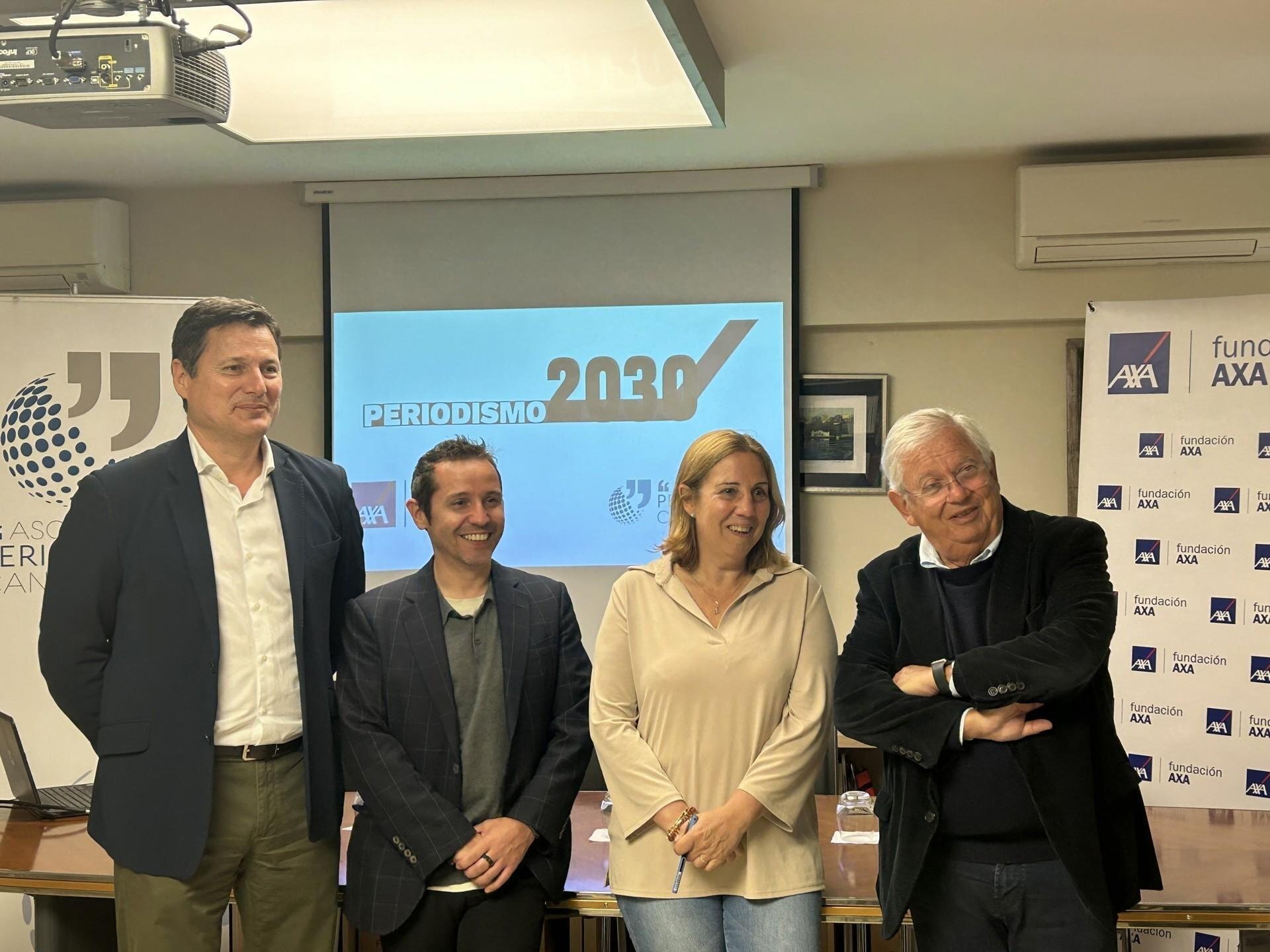 La presidenta de la Asociación de Periodistas de Cantabria (APC), Dolores Gallardo; Fernando Jáuregui y Sergio Martín, de Foro Periodismo 2030; y el director general de Fundación AXA, Josep Alfonso Caro, han presentado esta segunda encuesta, cuyo trabajo de campo concluyó a finales de diciembre de 2022, este martes, 11 de abril, en rueda de prensa en Santander.