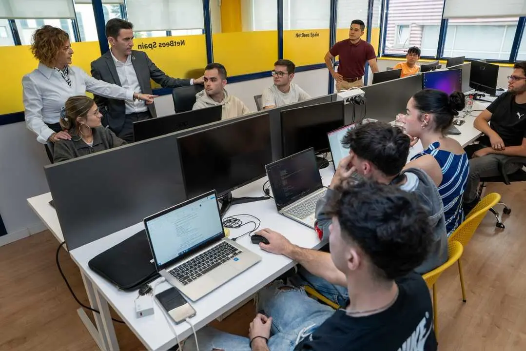Acompañado de la CEO de Netbees, Teresa Iglesias, el delegado del Gobierno ha conocido a los 12 jóvenes estudiantes de la Universidad de Cantabria, la Universidad Europea del Atlántico y de varios grados de Formación Profesional que están realizando sus prácticas o proyecto en este espacio.