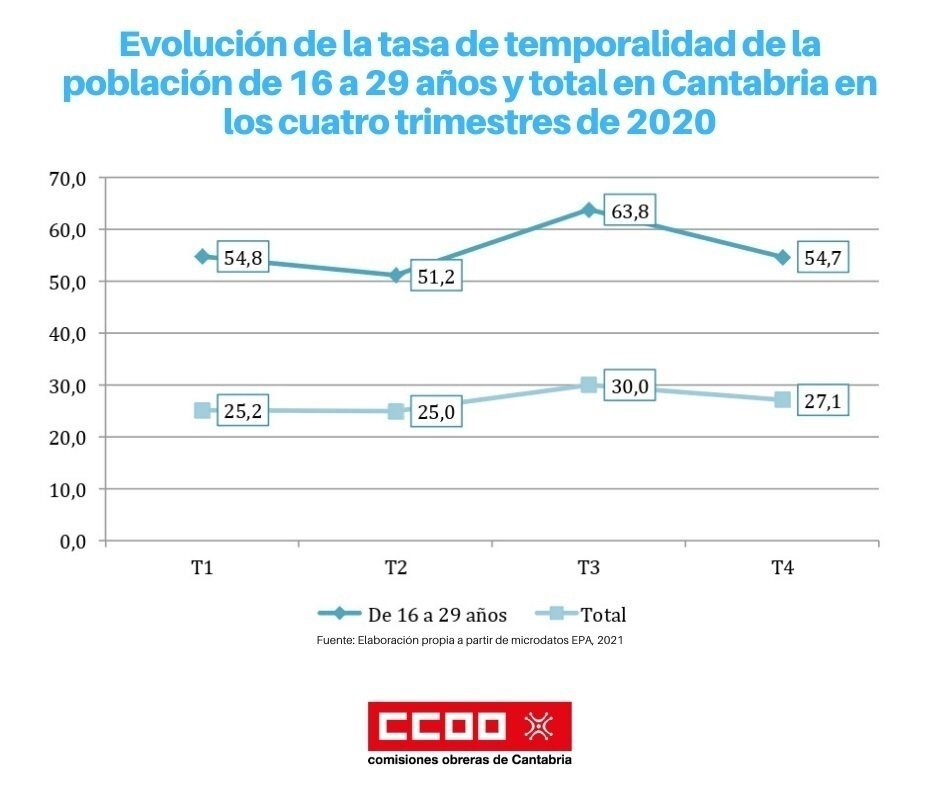 En este sentido, el sindicato ha subrayado que el 54,7% de los empleos de las personas entre 16 y 29 años fueron temporales en 2020, una cifra muy por encima de la de la población trabajadora de Cantabria en general, que es del 27,1%, es decir, más del doble.