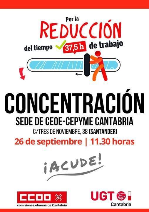 CCOO y UGT en Cantabria reivindicarán la reducción de la jornada laboral hasta las 37,5 horas en una concentración convocada para este jueves, 26 de septiembre, a partir de las 11.30 horas frente a la sede de la CEOE en la calle Tres de Noviembre de Santander.
