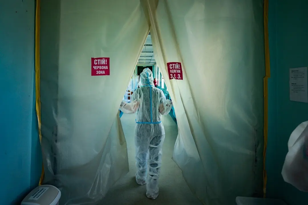 La foto ganadora 'UCI Covid 19 en Kiev' representa a un trabajador de la salud que ingresa en un área con pacientes con covid-19 en situación extrema en el área de cuidados intensivos de un hospital en Kiev, Ucrania. Las pancartas en la barrera de plástico dicen: ¡Alto!.