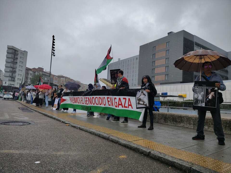 Centenares de personas de todas las edades -mil según los convocantes- han desafiado este mediodía a la lluvia y el viento para "abrazar" el Hospital Universitario Marqués de Valdecilla en Santander, en un cadena humana que ha exigido el fin del "genocidio" en Gaza.