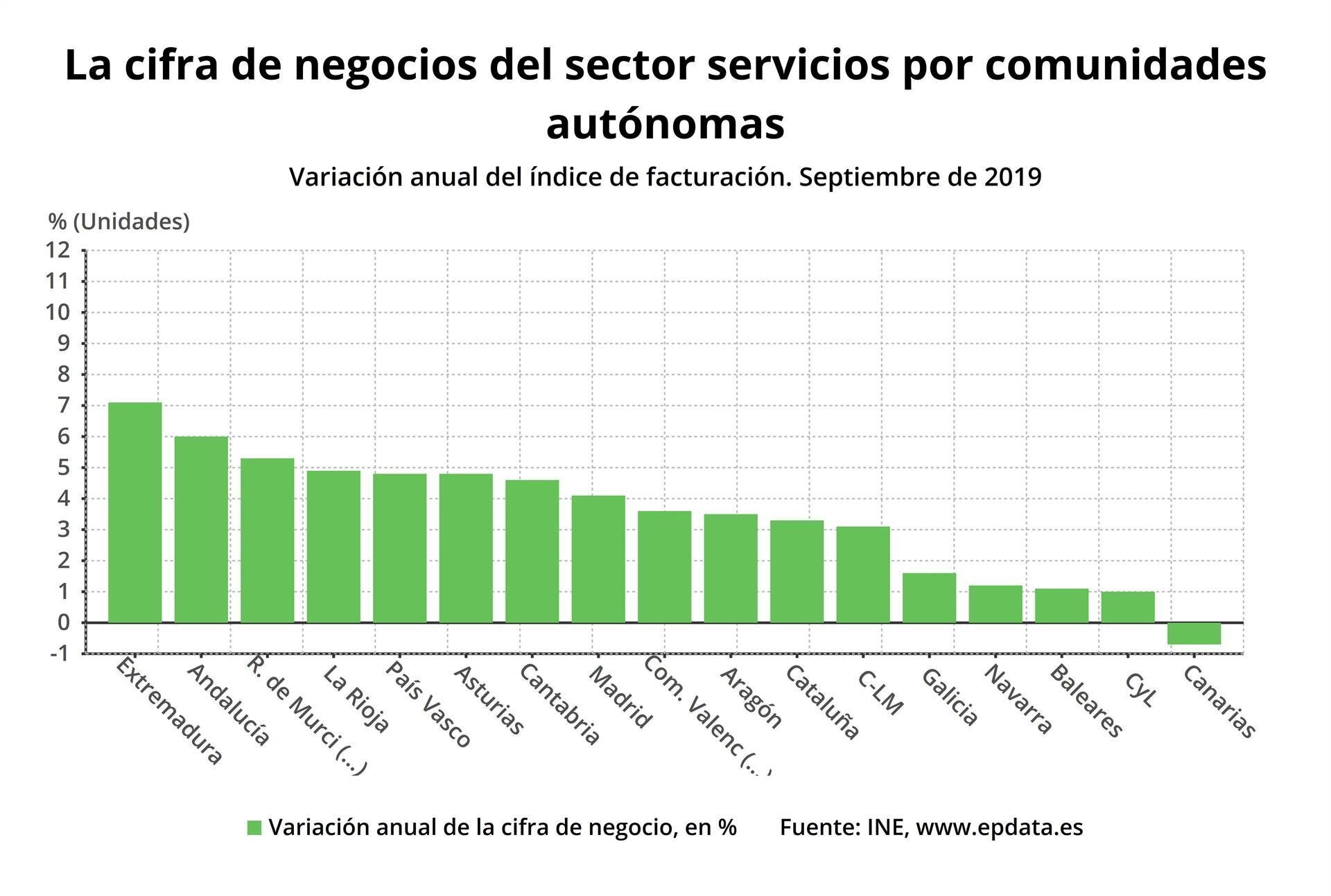 En España, el sector servicios registró un aumento de su facturación del 3,9% el pasado mes de octubre en relación al mismo mes de 2018, tasa cuatro décimas superior a la de septiembre. Con este repunte, los servicios encadenan ya 74 meses de ascensos interanuales.