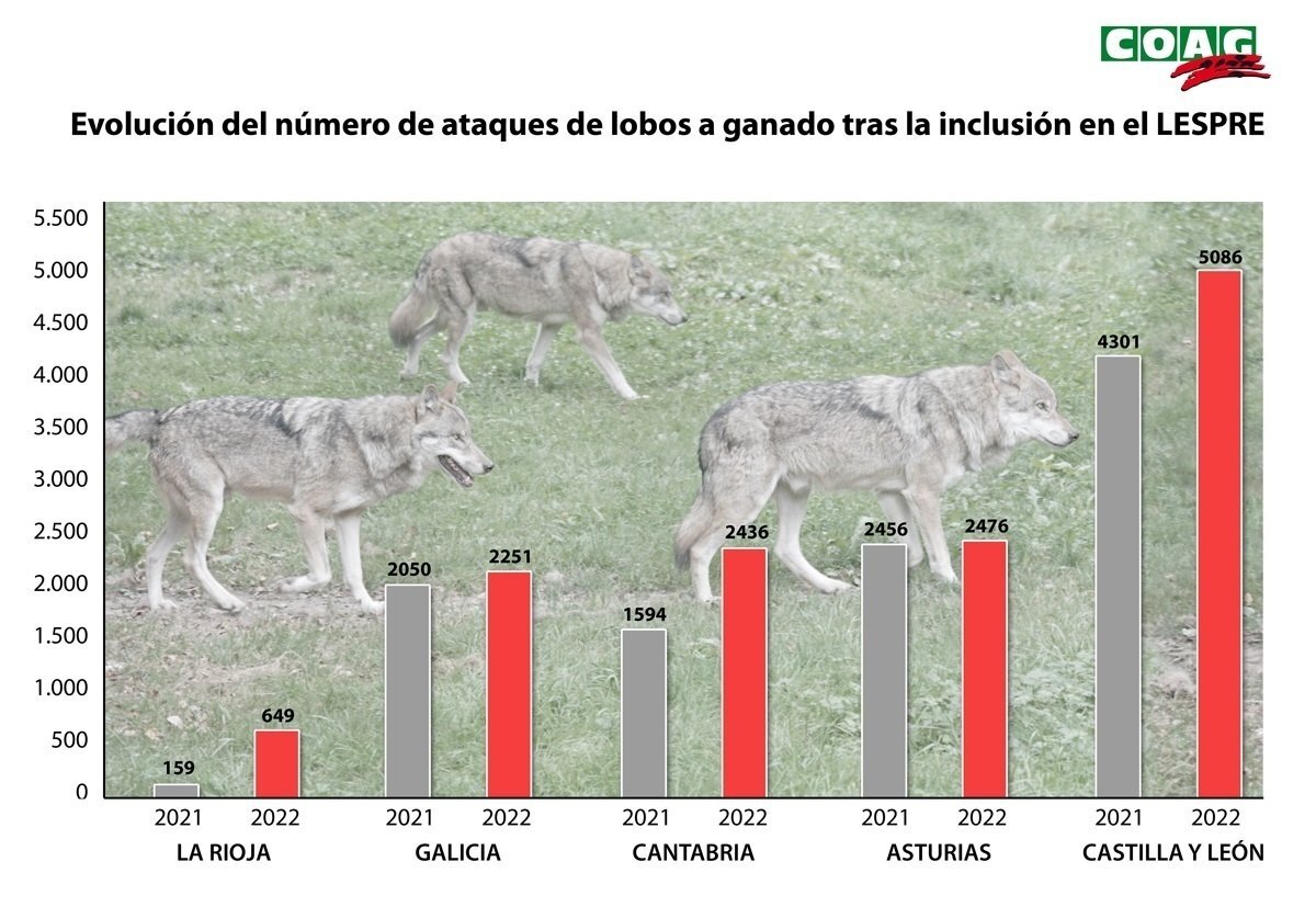 La Coordinadora de Organizaciones de Agricultores y Ganaderos(COAG) ha denunciado un aumento del 19 por ciento de los ataques de lobos a ganado en 2022, con 12.898 frente a los 10.560 del año anterior, registrados en las comunidades de Castilla y León, Asturias, Cantabria, Galicia y La Rioja.