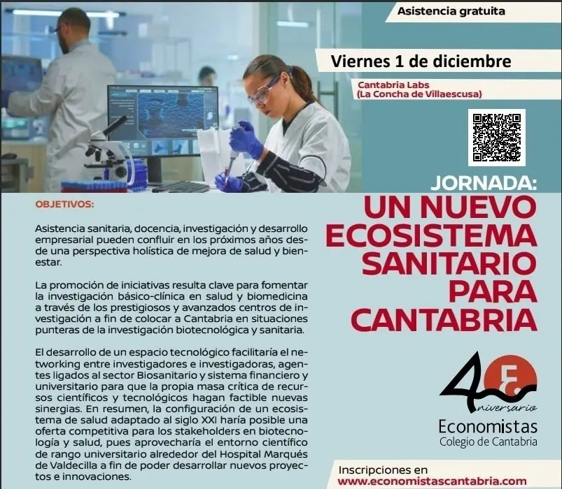 La cita, que cuenta con la colaboración de la Consejería de Salud y del Banco Santander, se desarrollará en la sede de Cantabria Labs, en La Concha de Villaescusa, desde las 9.00 hasta las 14.00, y la asistencia es gratuita, si bien se precisa inscripción para participar a través de la web del Colegio de Economistas.