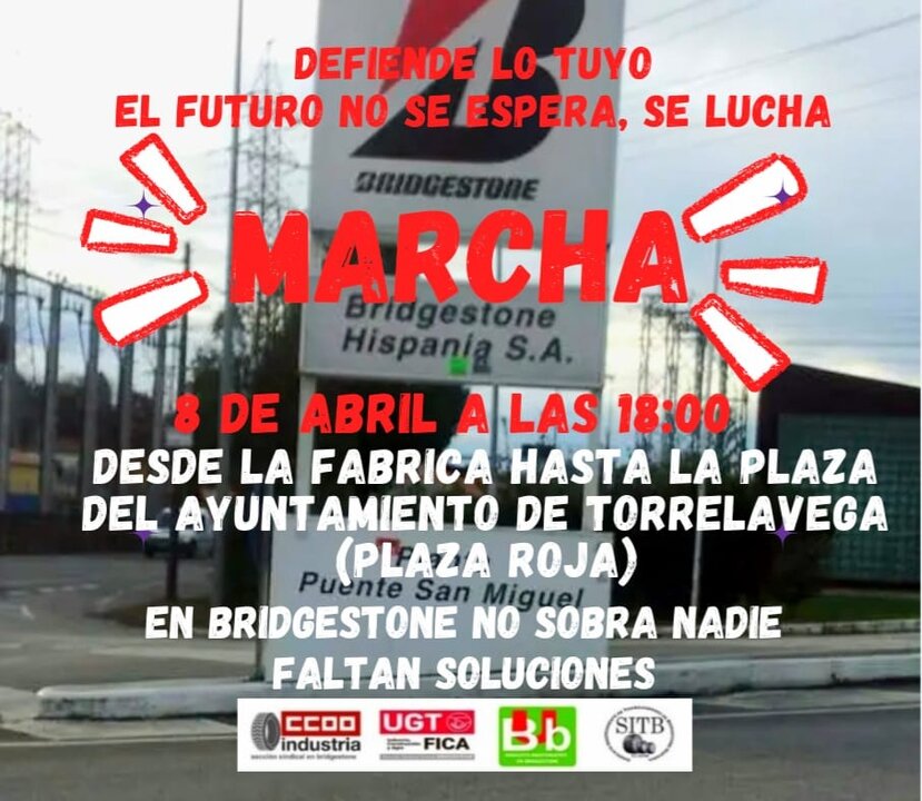 La marcha ya anunciada arrancará el martes a las 18.00 horas desde la portería de la fábrica de Puente San Miguel y discurrirá hasta la Plaza Roja de Torrelavega bajo el lema 'Defiende lo tuyo. El futuro no se espera, se lucha. En Bridgestone no sobra nadie, faltan soluciones'.