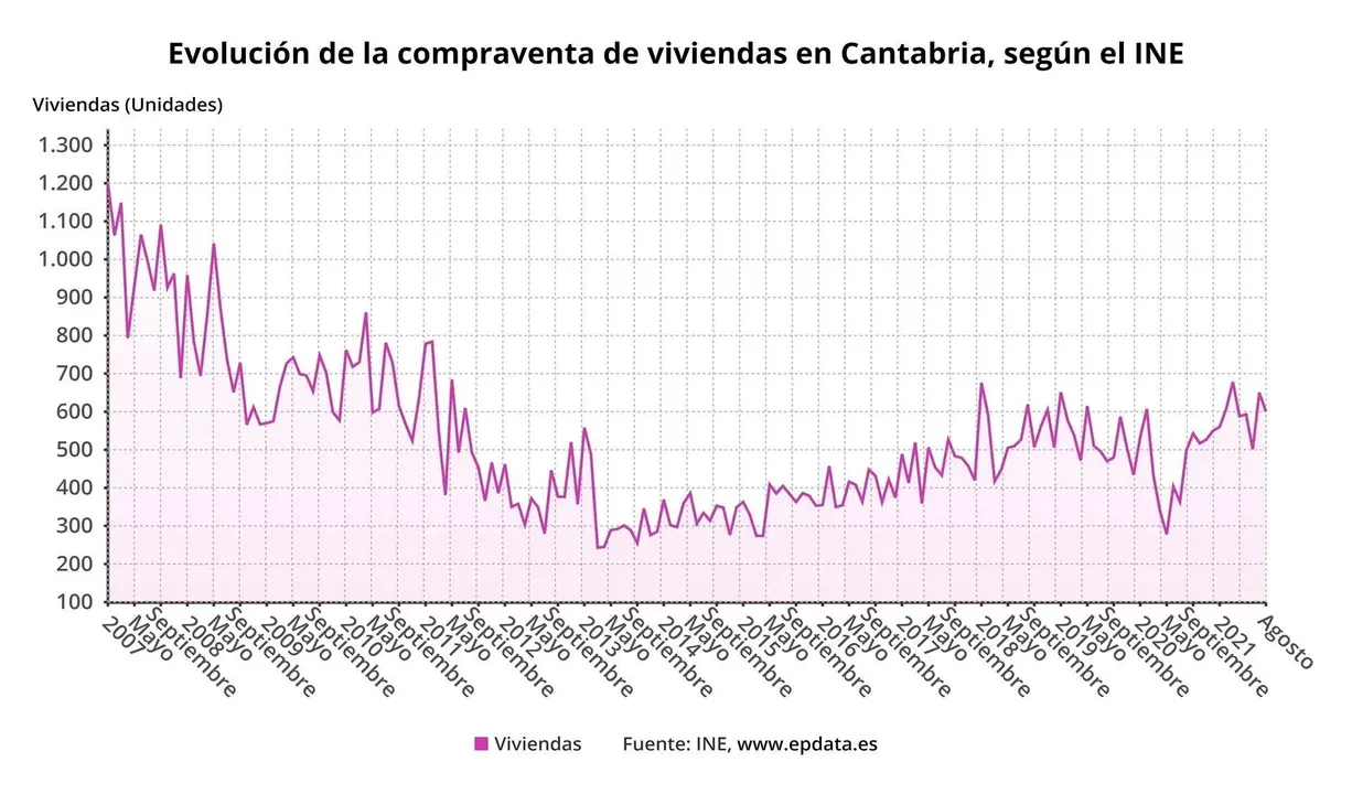 La compraventa de viviendas aumentó un 20% en agosto en Cantabria en relación con el mismo mes de 2020, hasta las 600 operaciones, según ha informado hoy el Instituto Nacional de Estadística (INE), que sitúa el incremento medio en el conjunto del país en un 57,8%.