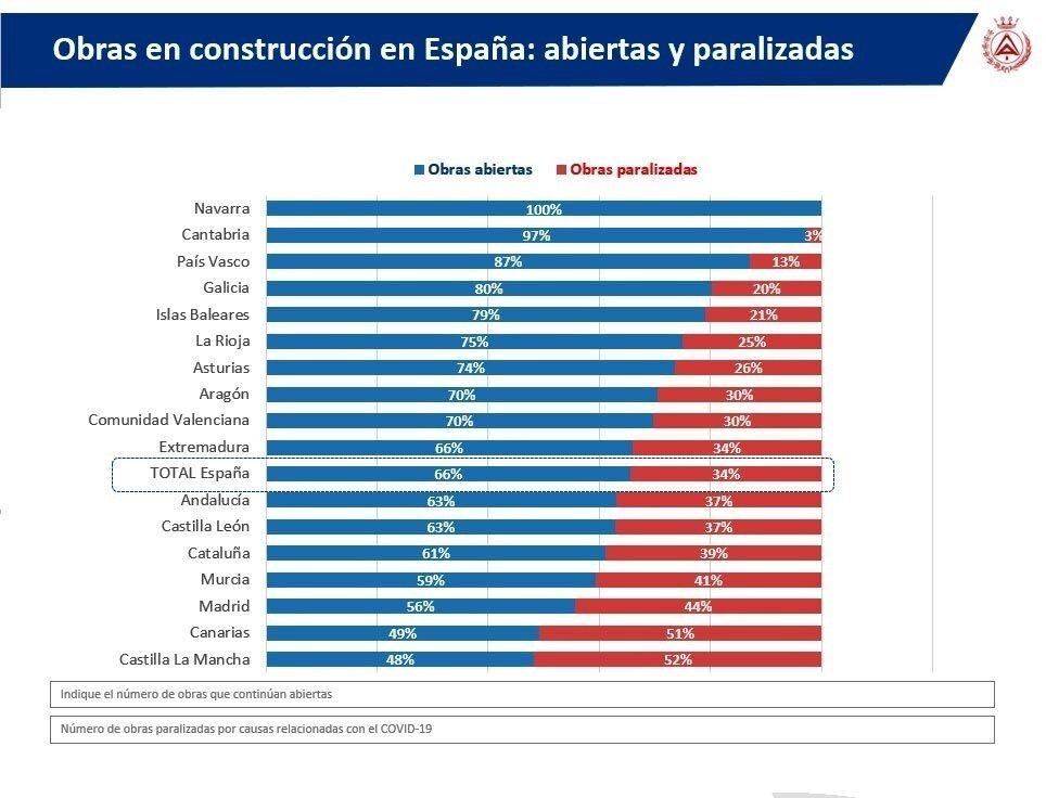 En el otro extremo se encuentran Castilla La Mancha, Canarias y Madrid, donde solo un 48%, un 49% y un 56% de obras, respectivamente, seguían en desarrollo.