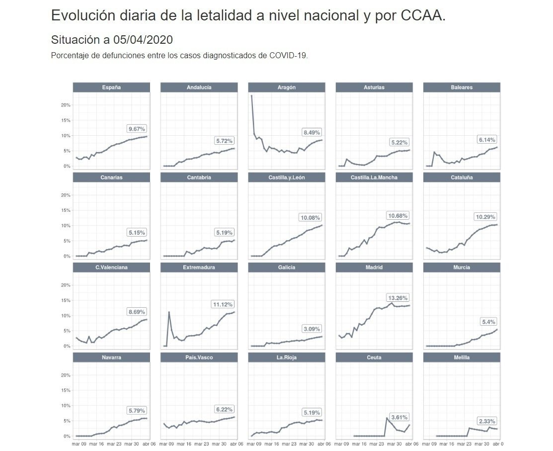 En cuanto a las ciudades autónomas de Ceuta y Melilla son las que registran menores tasas de letalidad, del 3,61% y del 2,33%.