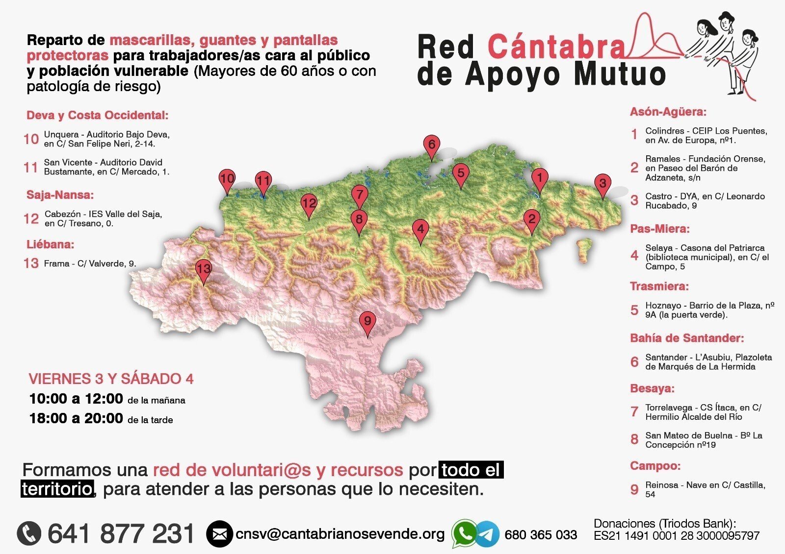 La Red Cántabra de Apoyo Mutuo repartirá en puntos de toda la región este viernes y sábado, 3 y 4 de abril, mascarillas, guantes y pantallas protectoras para personas en grupos de riesgo ante el coronavirus y para trabajadores de cara al público cuya empresa no pueda suministrárselos o no lo esté haciendo, así ocmo para pequeños comercios que no puedan acceder a estos recursos.