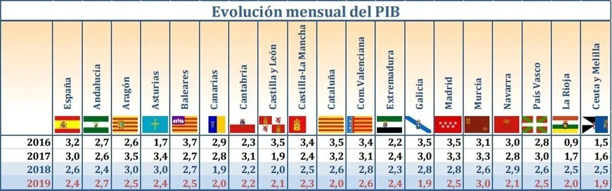 Murcia se sitúa como la región más dinámica en 2019, con un avance previsto del 3%. Tras ellas se situarían Andalucía (2,7%), Comunidad Valenciana (2,6%), Aragón (2,5%), Baleares (2,5%), Madrid (2,5%) y País Vasco (2,5%). Con un crecimiento estimado igual a la media nacional se encuentran las regiones de Asturias y Extremadura. Por debajo de esta media se sitúa el resto de regiones, con avances de entre el 1,9% y el 2,3%, entre ellas Cantabria (2,2%).