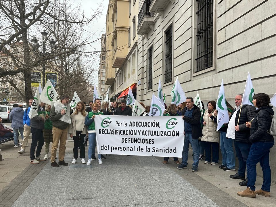 Alrededor de 30 trabajadores de la sanidad, convocados por CSIF, se han concentrado este miércoles en Santander frente a la Delegación de Gobierno en Cantabria, al igual que en otros puntos del país, para dar "un toque de atención" al Ministerio de Sanidad y exigirle que lleve a cabo "de una vez por todas" la adecuación, reclasificación y actualización de las funciones de todos los grupos profesionales del personal sanitario.