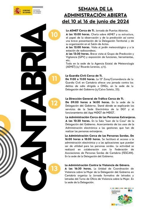 La Delegación del Gobierno en Cantabria se suma a la celebración de la Semana de la Administración Abierta con un programa de actividades que se celebrarán del 10 al 16 de junio y que incluye charlas y visitas a diferentes entidades.
