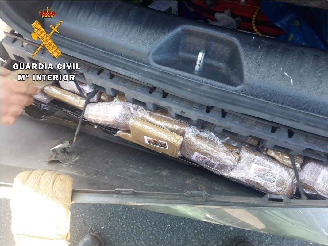 Los agentes inspeccionaron el punto señalado por el perro y localizaron un doble fondo situado en el parachoques trasero, donde se ocultaba un paquete de color verde.