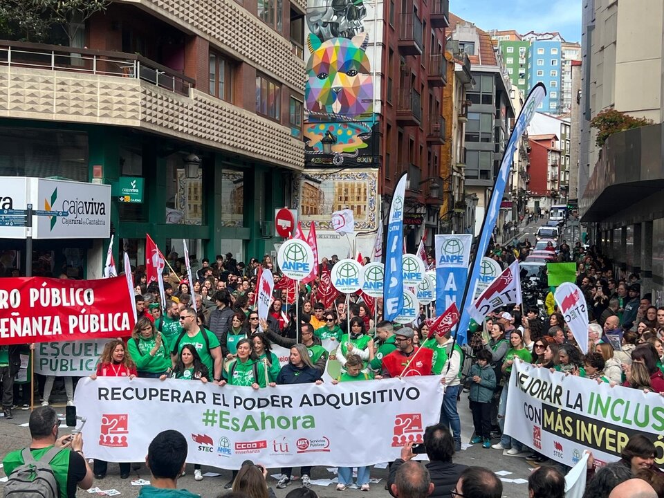 Los docentes cántabros recorren este jueves las calles Santander al grito de 'educación pública' en la jornada de huelga convocada para exigir su adecuación salarial ante la falta de acuerdo en las negociaciones con la Consejería de Educación, a la que acusan de mantener un "comportamiento autoritario".