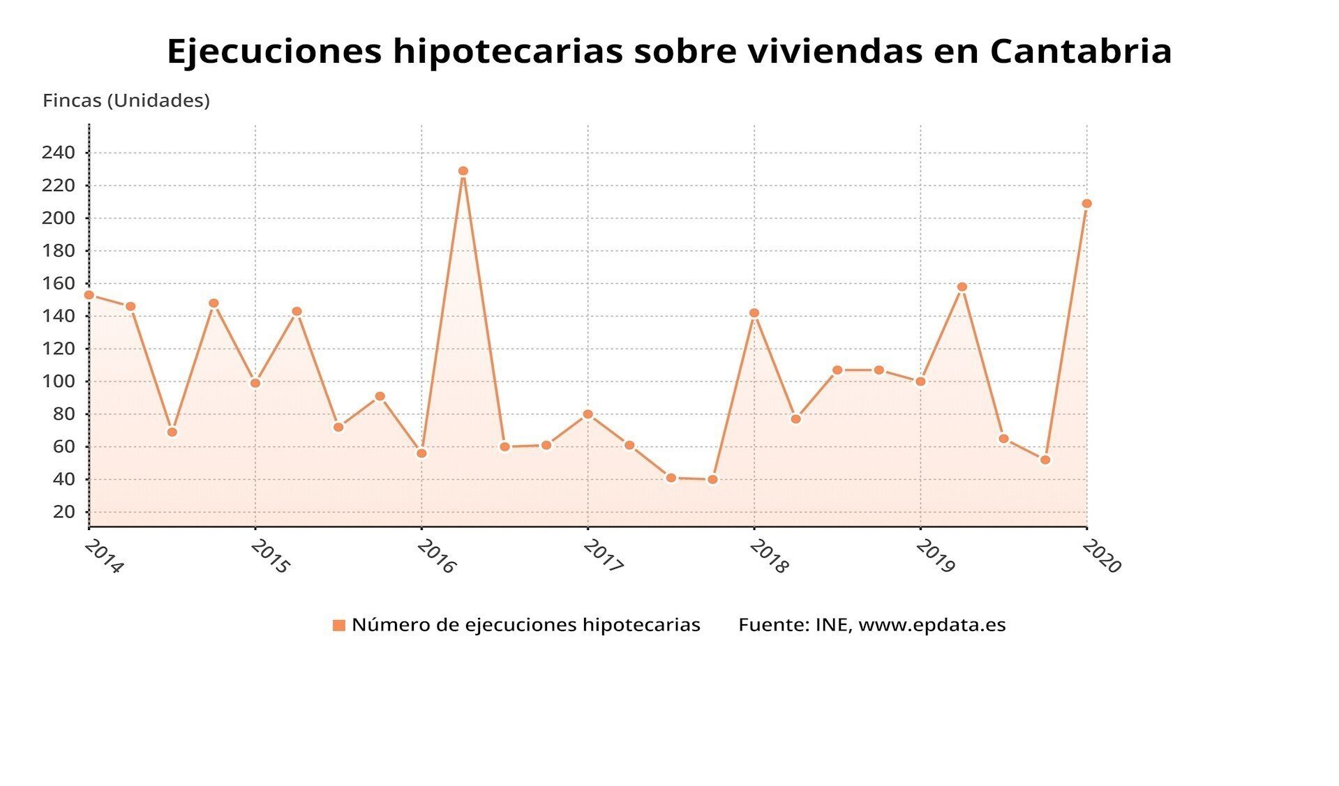 Cantabria registró 209 ejecuciones hipotecarias iniciadas sobre viviendas en el primer trimestre del año, lo que supone un 109% más que en el mismo trimestre de 2019, y un 302% más que en el trimestre anterior (cuarto de 2019), según la estadística de ejecuciones hipotecarias publicada hoy por el Instituto Nacional de Estadística (INE).