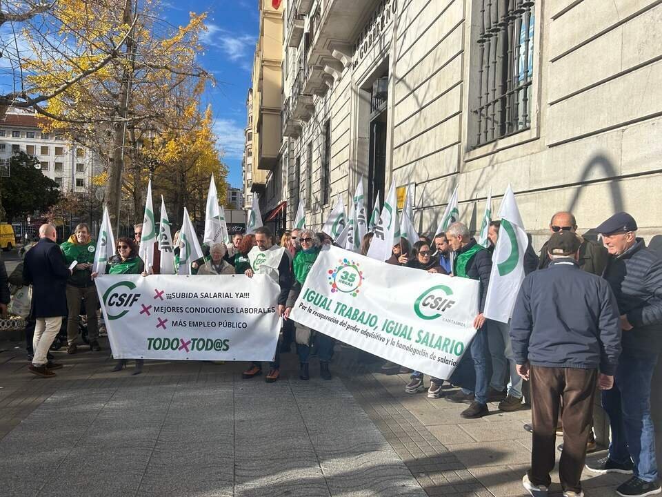 Medio centenar de empleados públicos se han concentrado este lunes frente a la Delegación del Gobierno en Cantabria para exigir la negociación de un nuevo acuerdo salarial que recoja la equiparación de sueldos entre las distintas administraciones públicas, la recuperación de las estructuras salariales de la paga extra y una nueva Oferta de Empleo Público (OEP).