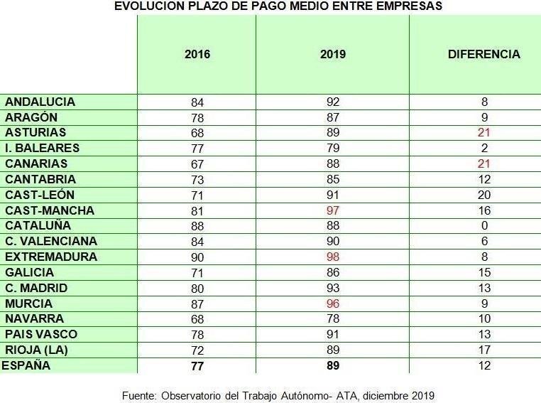 Sin embargo, las empresas afincadas en Canarias y Asturias son las que más han incrementado los periodos medios de pago en los últimos tres años, pasando de 68 a 89 días en el caso de Asturias y de 67 a 88 las canarias.