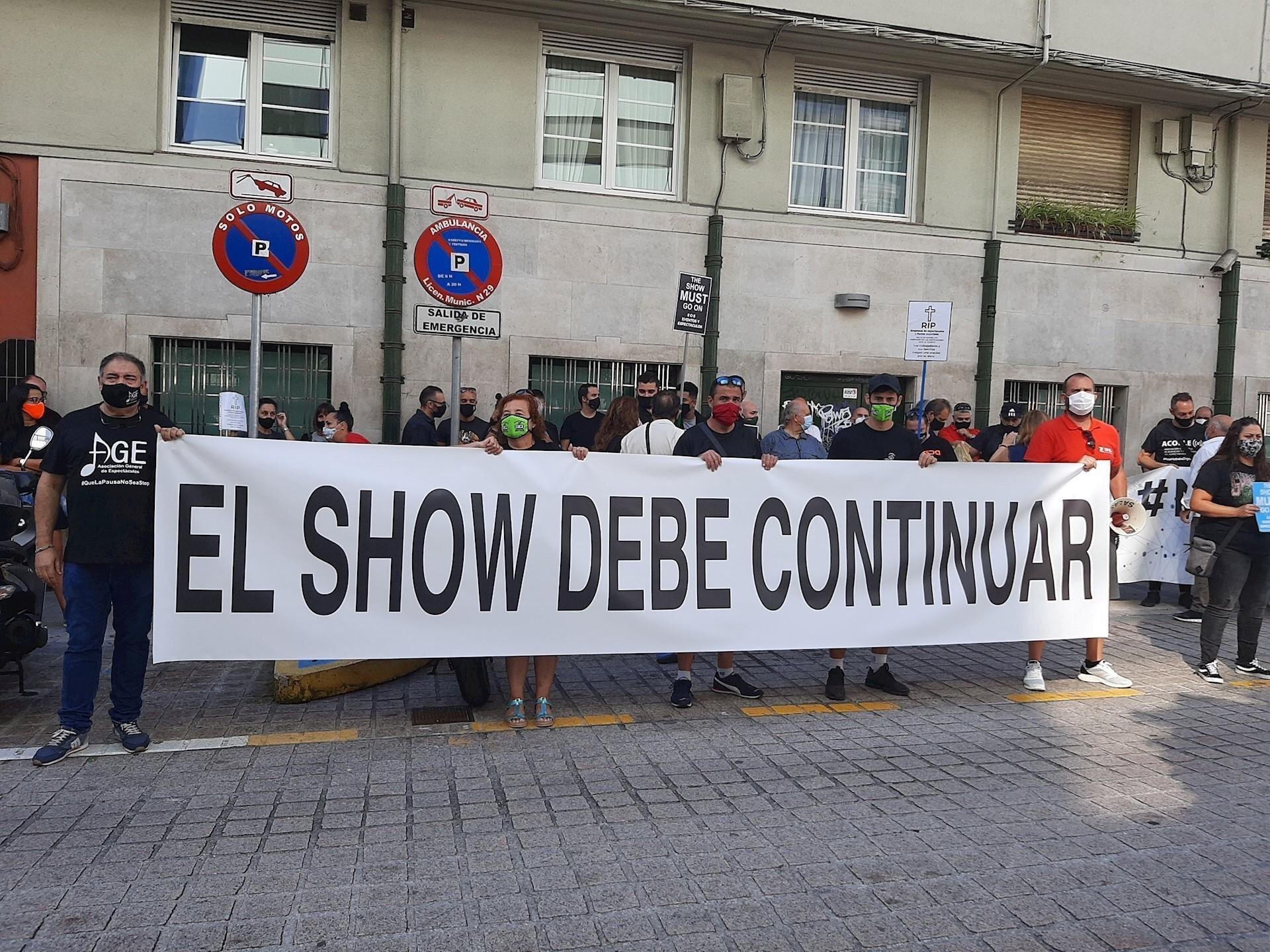 Representantes de empresas de eventos y espectáculos de Cantabria han protestado este jueves ante la sede del Gobierno regional para reclamar ayudas a un sector que está "en una situación límite, al borde de la ruina absoluta y con un altísimo riesgo de cerrar, de forma definitiva, nuestros negocios".