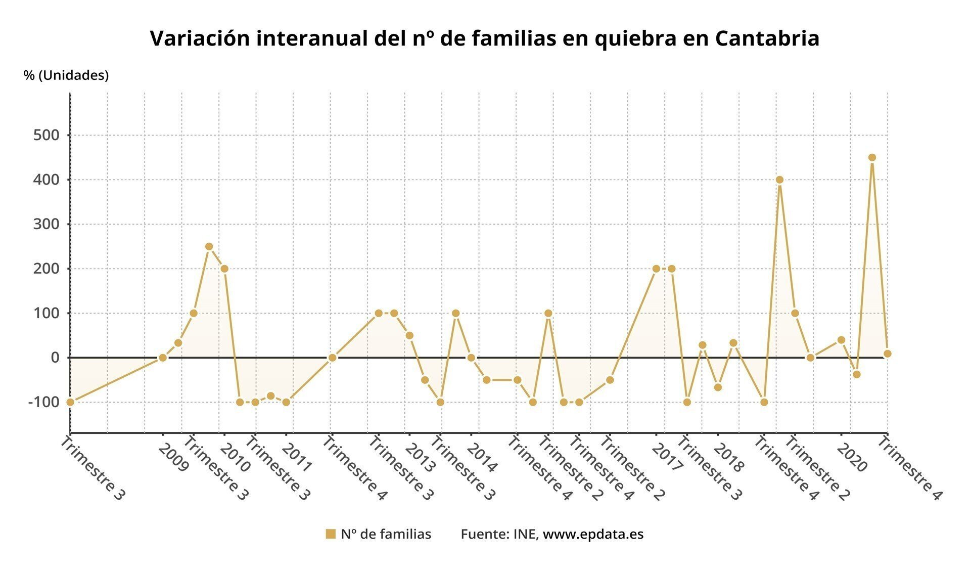 De octubre a diciembre 12 familias se declararon en quiebra, frente a 11 en el tercer trimestre (9%); mientras que el número de empresas en esta situación se redujo un -11%, con nueve compañías en esta situación en el último trimestre del año pasado.