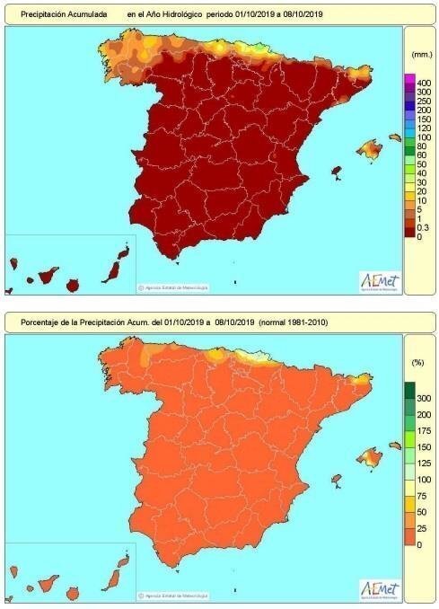 Las lluvias acumuladas en los primeros días del año hidrológico, que comenzó el pasado 1 de octubre, hasta el día 8, apenas alcanzan el 6 por ciento del valor normal en el conjunto de España, según datos de la Agencia Estatal de Meteorología (AEMET).