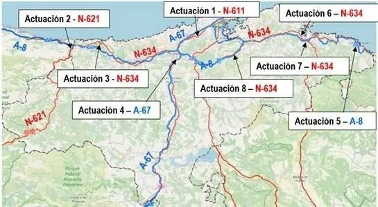 Este paquete de actuaciones mejorará la seguridad vial en intersecciones, enlaces o travesías de la N-611, N-621 y N-634, y en las autovías de la Meseta A-67 y del Cantábrico A-8.