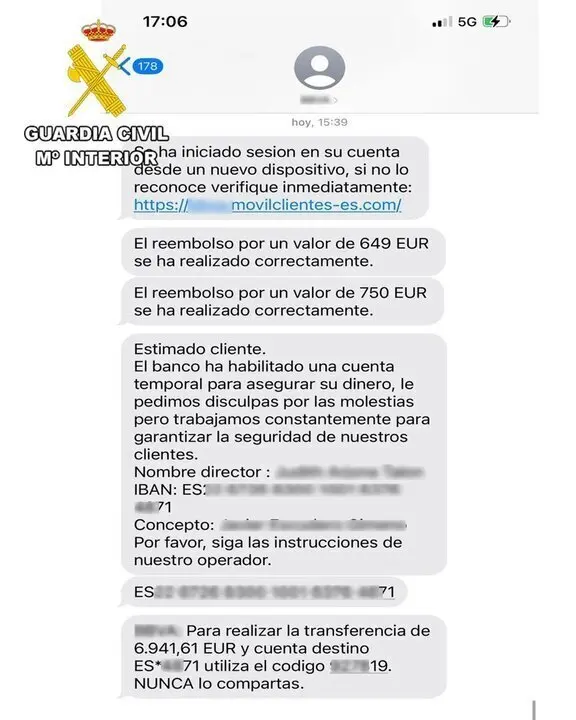La Guardia Civil recuerda que los bancos no remiten sms con enlaces para introducir las credenciales de la banca online. Tampoco solicitan dichas credenciales, datos bancarios o incluso códigos de validación vía llamada telefónica. Igualmente hay que leer detenidamente los sms que dan información de la operativa a realizar, antes de llevar a cabo ninguna acción.
