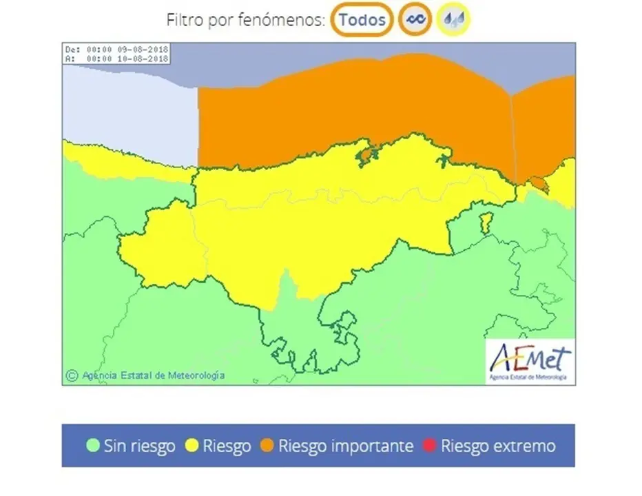 Concretamente, el nivel naranja por oleaje permanecerá vigente entre las 3.00 y las 8.00 horas del jueves, 9 de agosto, y se espera para este periodo "un rápido y brusco cambio del viento al noroeste, arreciando a fuerza 7 o 8, avanzando de oeste a este".