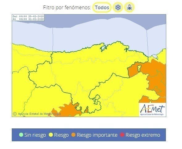 El riesgo por nevadas, también de nivel amarillo, se extenderá por toda la comunidad y estará activo desde las 3.00 de las madrugada hasta las 12.00 horas.