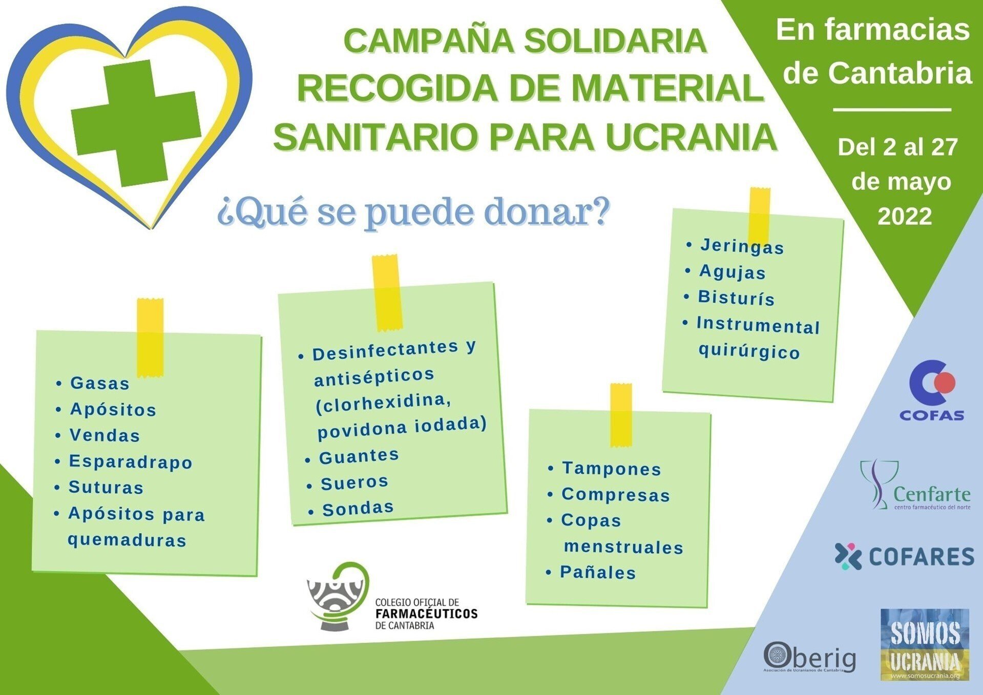 La Asociación de Ucranianos de Cantabria Oberig y la Fundación Somos Ucrania han organizado una campaña solidaria de recogida de material sanitario y alimentos para Ucrania, que se desarrollará hasta el 27 de mayo en las 279 farmacias de la región que voluntariamente quieran participar, además de en los 86 establecimientos de la cadena Lupa Supermercados.