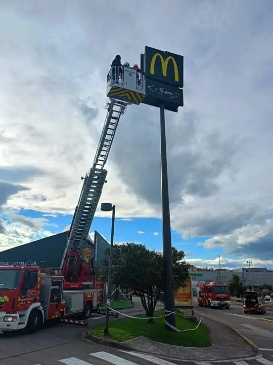 Los bomberos del parque de Los Corrales de Buelna se desplazaron con la autoescala hasta Camargo por el riesgo de caída de un cartel de grandes dimensiones en el entorno de una zona comercial con gran afluencia de personas y vehículos.