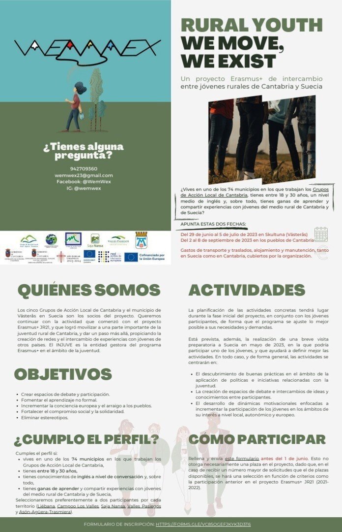 Los cinco Grupos de Acción Local (GAL) de Cantabria han puesto en marcha un nuevo Erasmus+, el proyecto 'WemWex: Rural Youth, We Move, We Exist', con el que jóvenes de la región viajarán hasta Suecia para compartir experiencias con otros jóvenes suecos de zonas rurales.