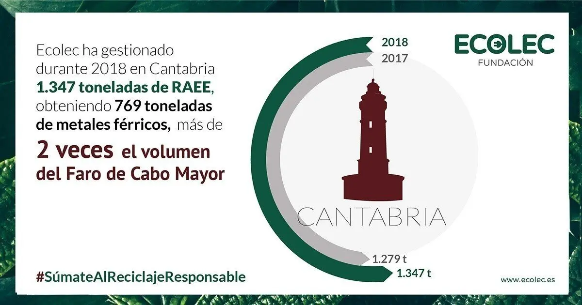 Fundación ECOLEC, organización sin ánimo de lucro que centra su actividad en el reciclaje de aparatos eléctricos y electrónicos (RAEE), ha gestionado a lo largo de 2018 en Cantabria 1.347 toneladas de este tipo de residuos, un 5,3% más que en 2017.