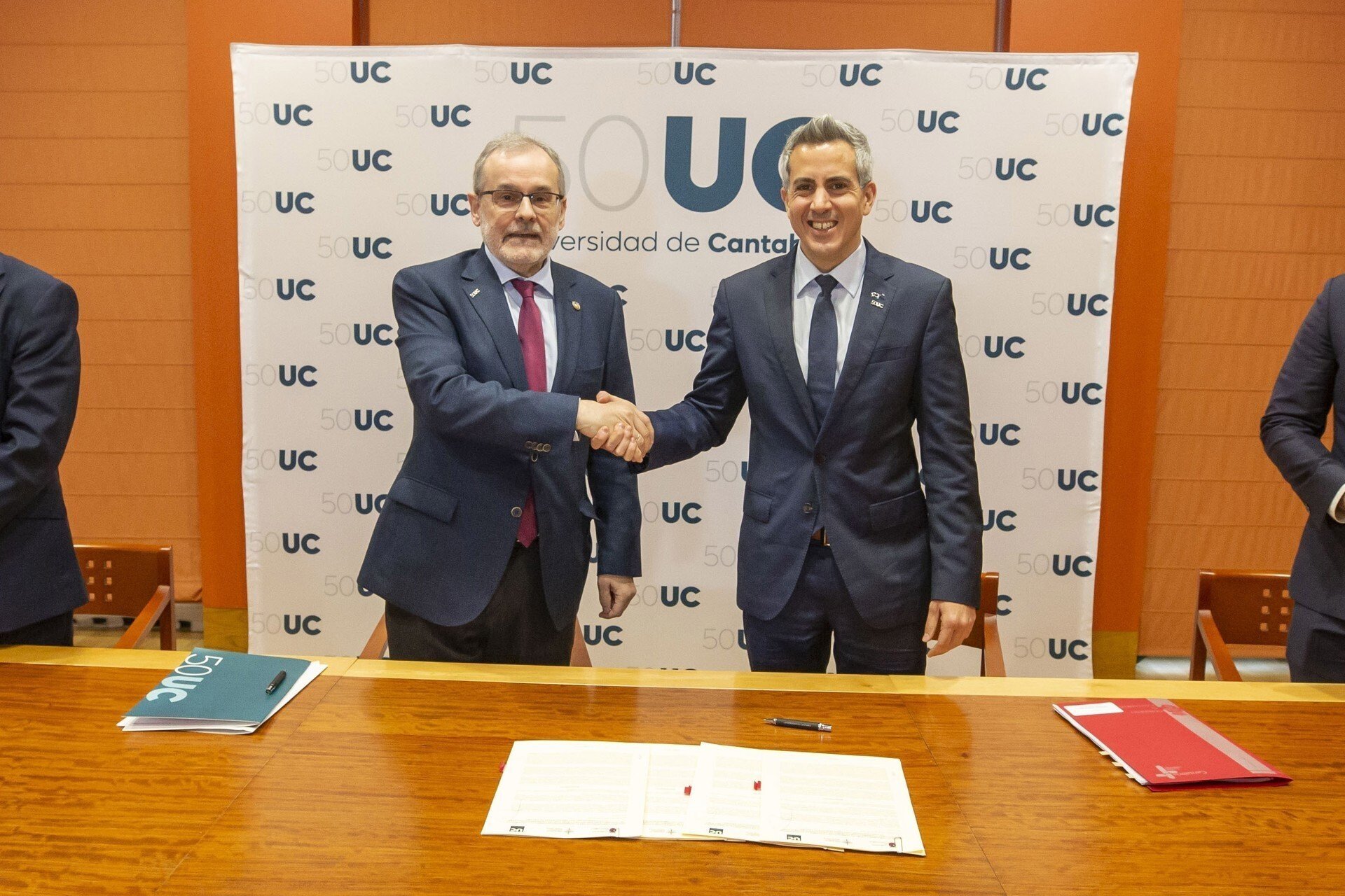 El vicepresidente del Gobierno de Cantabria, Pablo Zuloaga, y el rector de la Universidad de Cantabria, Ángel Pazos, han sido los encargados de estampar hoy la firma del nuevo acuerdo que se debe, según Zuloaga, al "firme compromiso" con una institución que es "un ascensor social" y "puntal" en la economía del conocimiento que "lidera el Ejecutivo tras la aprobación de la ley de Ciencia", para asegurar "el mejor futuro para Cantabria y "más y mejor empleo para los cántabros".