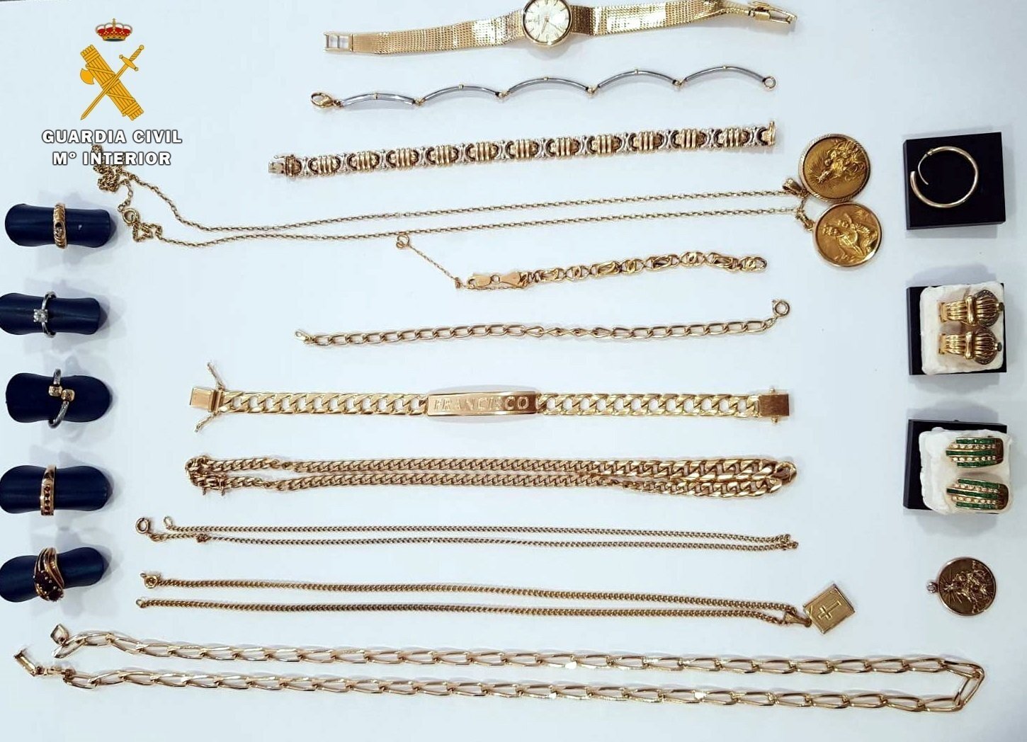 Entre estas joyas hay diferentes piezas de oro, como cadenas, una de ellas con un libro con una cruz en el exterior y en su interior otra imagen de una Virgen de la Barquera, tres medallas con la imagen de la Virgen del Carmen, un reloj, anillos, pendientes y pulseras, una de ellas tipo esclava con el nombre de Francisco.