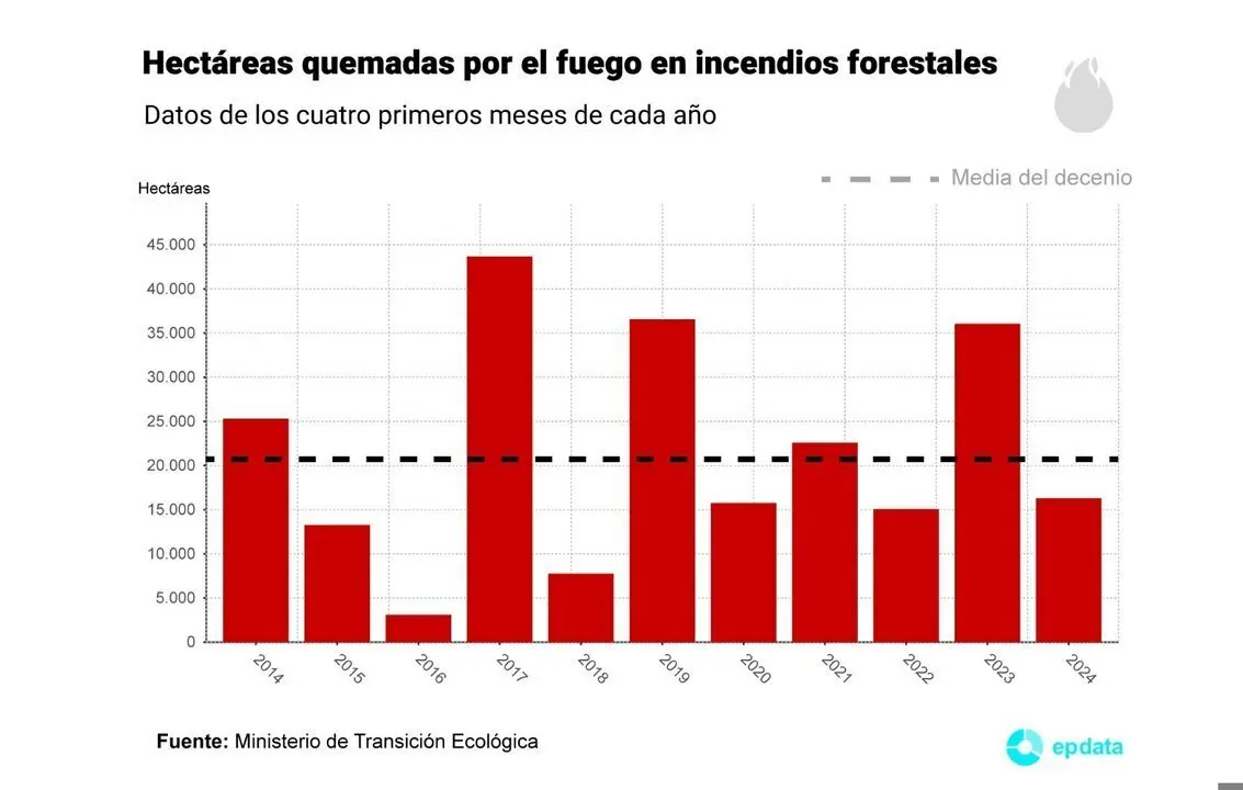 Estas cifras sitúan a 2024 como el sexto año con más hectáreas calcinadas hasta el momento de entre los últimos diez. Si bien está muy lejos de las cifras de 2023 --el segundo año con más hectáreas quemadas hasta abril de la década--, se encuentra por delante de 2022, cuando hasta abril se quemaron 15.071 ha.