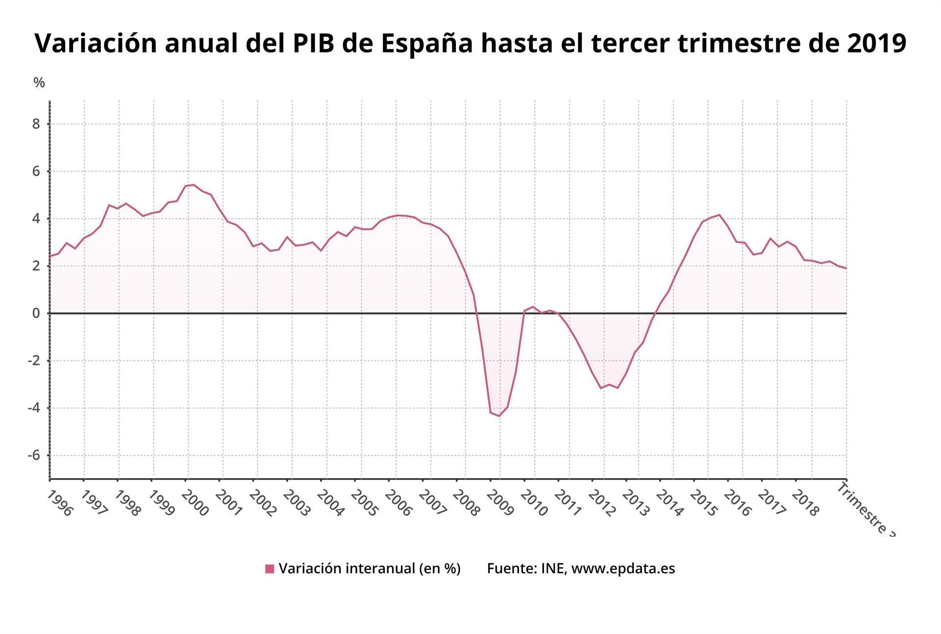 En valores interanuales, la economía española desaceleró una décima su crecimiento, hasta el 1,9%, una décima menos de lo que había anticipado el INE a finales de octubre. Este crecimiento se basó casi exclusivamente en la demanda interna, que aportó 1,8 puntos, frente a un sector exterior que sólo contribuyó con una décima al avance interanual del PIB.