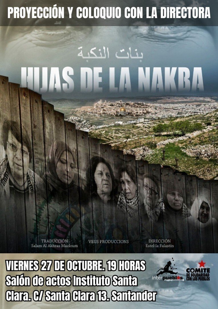 El Comité de Solidaridad con los Pueblos-Interpueblos ha organizado la proyección de la película documental sobre Palestina 'Las hijas de la Nakba' y el posterior coloquio con su directora, Este la Falastin. La cinta se podrá ver el jueves 26, a las 19 horas en la Sala Mauro Muriedas de Torrelavega, y el viernes 27, a las 19.00 horas, el IES Santa Clara de Santander.