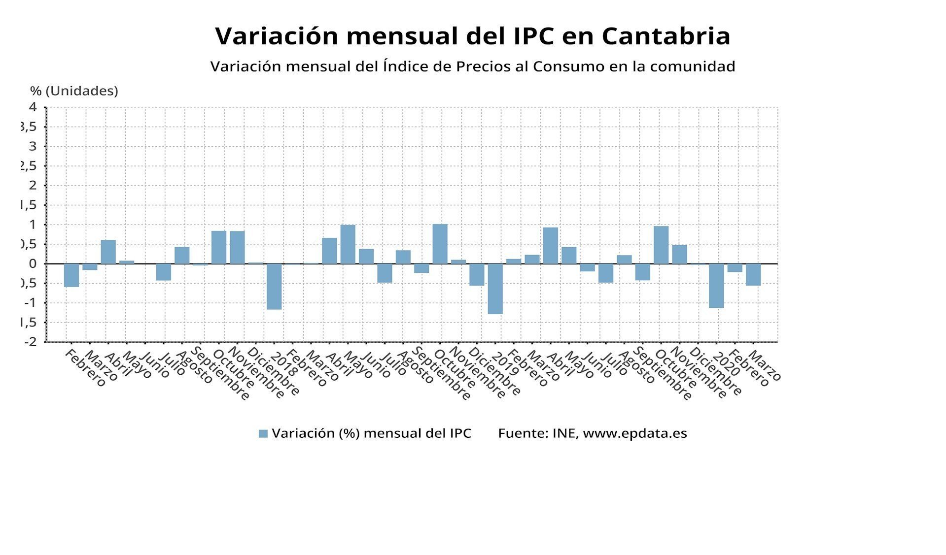 El Índice de Precios de Consumo (IPC) en Cantabria bajó un -0,1% en marzo en comparación con el mismo mes del año anterior, frente al estancamiento de la media nacional, y retrocedió seis décimas respecto al pasado mes de febrero, dos décimas que el global (-0,4%), según ha informado hoy el Instituto Nacional de Estadística (INE).