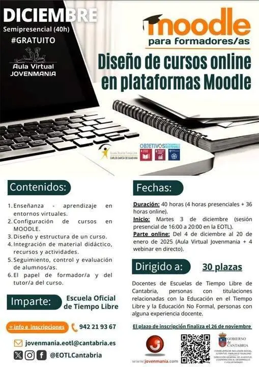 La Dirección General de Juventud, Cooperación al Desarrollo y Voluntariado del Gobierno de Cantabria da comienzo este martes al curso 'Diseño de cursos online en plataformas Moodle', dirigido a la formación del personal docente de las Escuelas de Tiempo Libre de la región y a aquellos profesionales que se dedican a la formación, principalmente en los ámbitos de la Educación en el Tiempo Libre y la Educación no Formal.