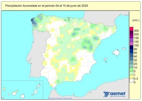 Durante el periodo del 4 al 10 de junio las precipitaciones afectaron a muchas zonas peninsulares, aunque fueron escasas y se dieron en menor medida en una franja en el tercio oeste y en el levante, exceptuando Castellón y Tarragona. Además, en ambos archipiélagos apenas se registraron precipitaciones. En este marco, solo se superaron los 10 l/m2 en la mitad oeste de Galicia y de manera dispersa en Cantabria, en el sistema ibérico y en un área entre las provincias de Teruel, Tarragona y Castellón.