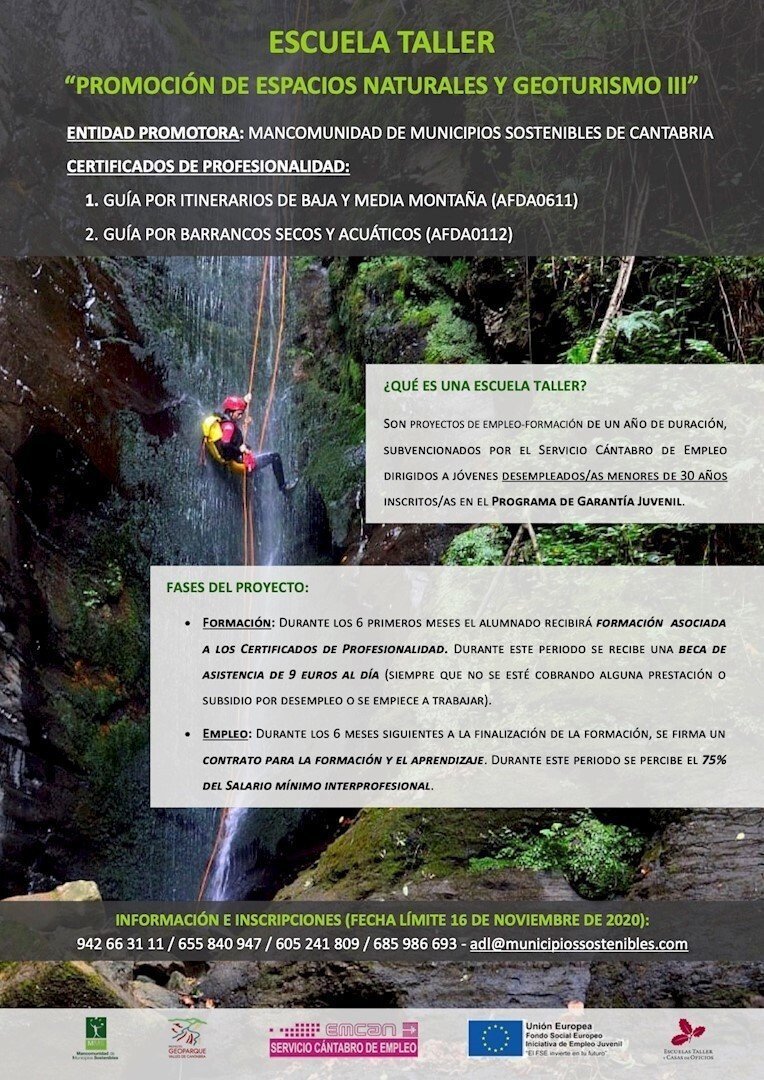 La Mancomunidad de Municipios Sostenibles de Cantabria ha abierto la inscripción para la escuela taller 'Promoción de Espacios Naturales y Geoturismo III', con la que se va a formar a jóvenes desempleados menores de 30 años para ser guías en entornos de montaña y barrancos.