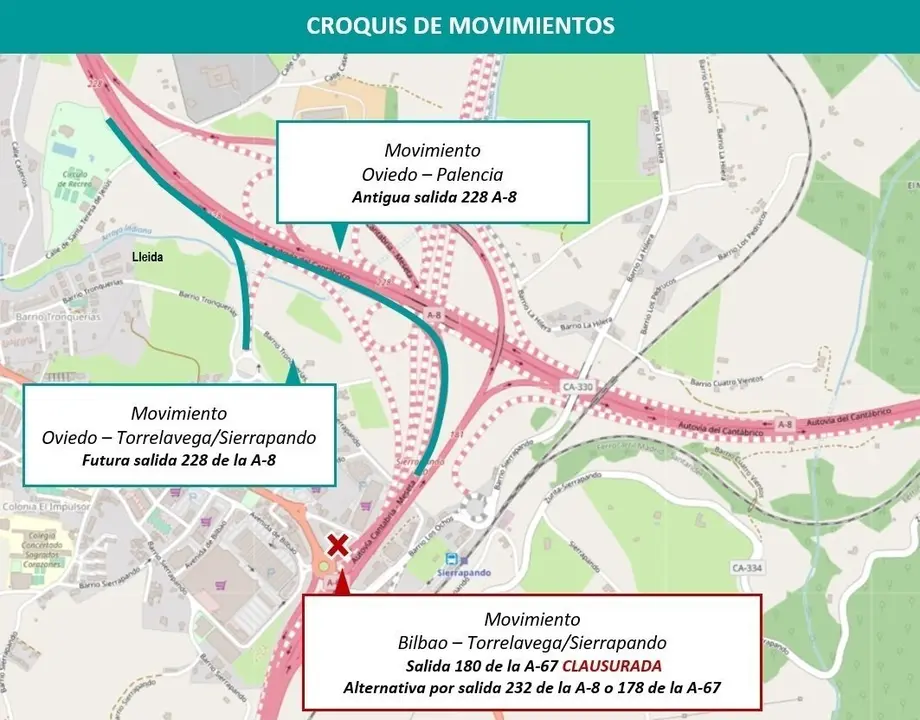 El tráfico proveniente de Oviedo con destino Palencia continuará por el trazado actual de la antigua salida 228 de la A-8; el movimiento de Oviedo a Torrelavega/Sierrapando se realizará a través de la nueva salida 228; y en el caso del tráfico de Bilbao a Torrelavega/Sierrapando, la salida se realizará por la 232 de la A-8 y la 178 de la A-67, ambas con la señalización correspondiente.