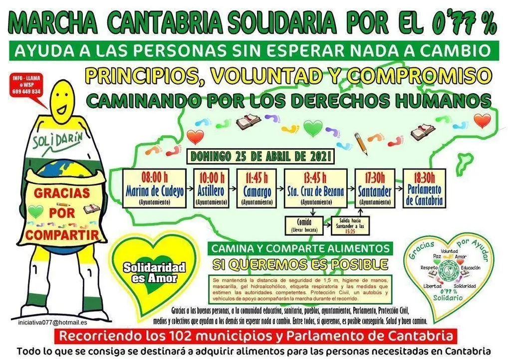 El coordinador de la iniciativa, Julio Lago, ha agradecido la implicación del Parlamento, municipios y organizaciones sociales; y ha detallado que la marcha comenzará a las 08.00 horas en Marina de Cudeyo, llegará a Astillero a las 10.00, alcanzará el Ayuntamiento de Camargo a las 11.45 y a las 13.45 horas hará una parada en Santa Cruz de Bezana "para reponer fuerzas".