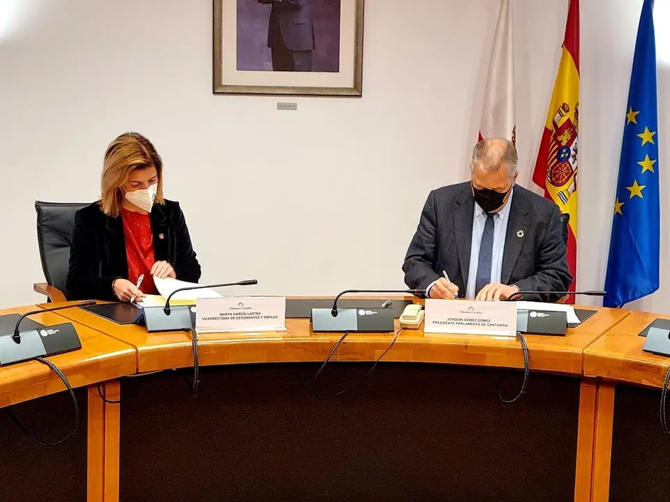 El presidente del Parlamento, Joaquín Gómez, y la vicerrectora de Estudiantes y Empleo de la Universidad de Cantabria (UC), Marta Lastra, han firmado un convenio de cooperación educativa para que cuatro alumnos del Grado de Derecho realicen prácticas en los diferentes servicios de la Cámara regional durante el segundo semestre del curso académico.