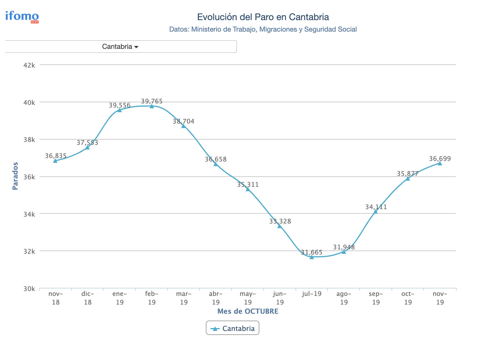 El número de parados registrados en las oficinas de empleo en Cantabria subió en 822 personas en noviembre, lo que supone un 2,29% más que en octubre, el segundo mayor repunte de todas las comunidades tras Baleares (22,8%) y superior a la media nacional (0,6%).
