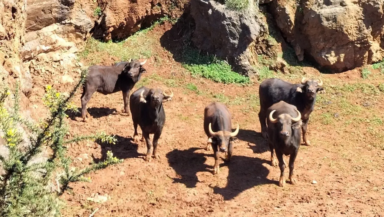 El grupo de cinco búfalos cafre llegó al parque el 30 de marzo y en estos primeros días se va adaptando a su nuevo hogar. Está comandado por una hembra de cinco años y se mantiene unido como muestra de su fortaleza.